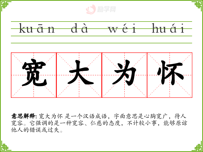 宽大为怀 是一个汉语成语,字面意思是心胸宽广,待人宽容。它强调的是一种宽容、仁慈的态度,不计较小事,能够原谅他人的错误或过失。