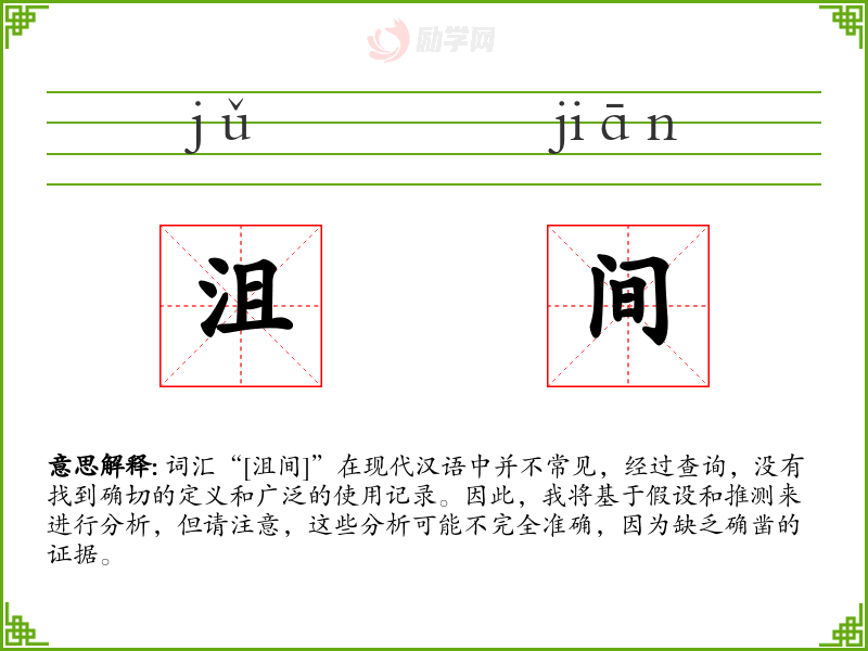 词汇“[沮间]”在现代汉语中并不常见,经过查询,没有找到确切的定义和广泛的使用记录。因此,我将基于假设和推测来进行分析,但请注意,这些分析可能不完全准确,因为缺乏确凿的证据。