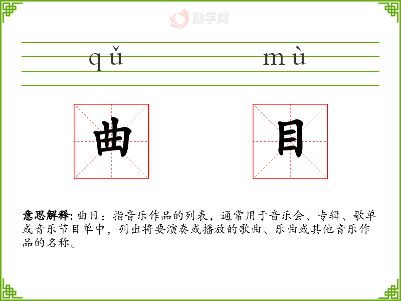 曲目的意思是:剧本或歌曲目录。亦指歌曲和其他音乐作品等的名目。