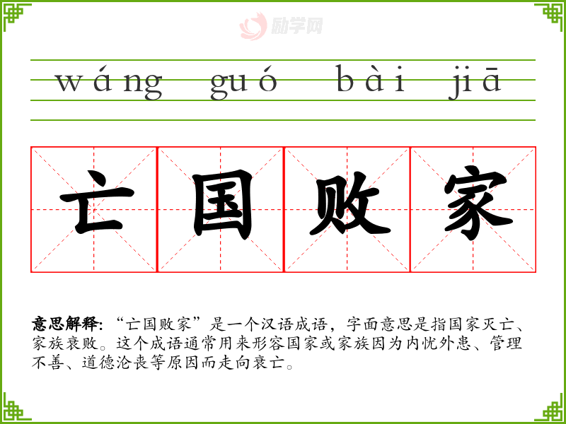 “亡国败家”是一个汉语成语,字面意思是指国家灭亡、家族衰败。这个成语通常用来形容国家或家族因为内忧外患、管理不善、道德沦丧等原因而走向衰亡。