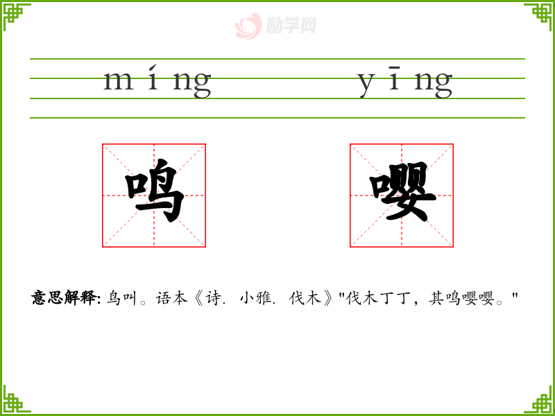 《说文》-鸣,鸟声也。 《管辂别传》-鸟兽之音曰鸣。 《易·中孚》-鸣鹤在阴。 《诗·大雅·卷阿》-凤皇鸣矣。 《诗·鸡鸣》-鸡既鸣矣,朝既盈矣。 陶渊明《归园田居》-狗吠深巷中,鸡呜桑树巅。