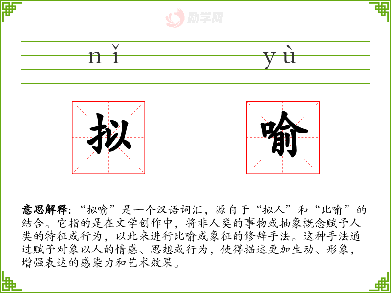 “拟喻”一词在中文中较为现代,结合了“拟人”和“比喻”的概念。在古代文学中,类似的修辞手法被称为“拟人”或“比喻”,随着语言的发展,“拟喻”这一词汇逐渐被用来更精确地描述这种结合了拟人和比喻的修辞手法。
