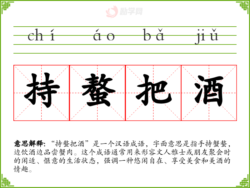 “持螯把酒”这个成语不仅描述了一种具体的生活场景,更体现了一种生活态度和文化价值观。在语言学*和表达中,理解和运用这样的成语能够丰富我们的表达方式,增强语言的文化内涵。
