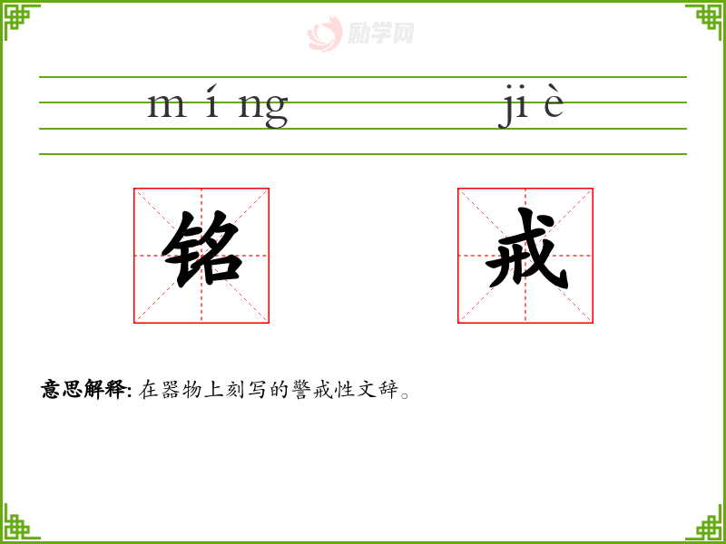 铭戒的意思是:在器物上刻写的警戒性文辞。