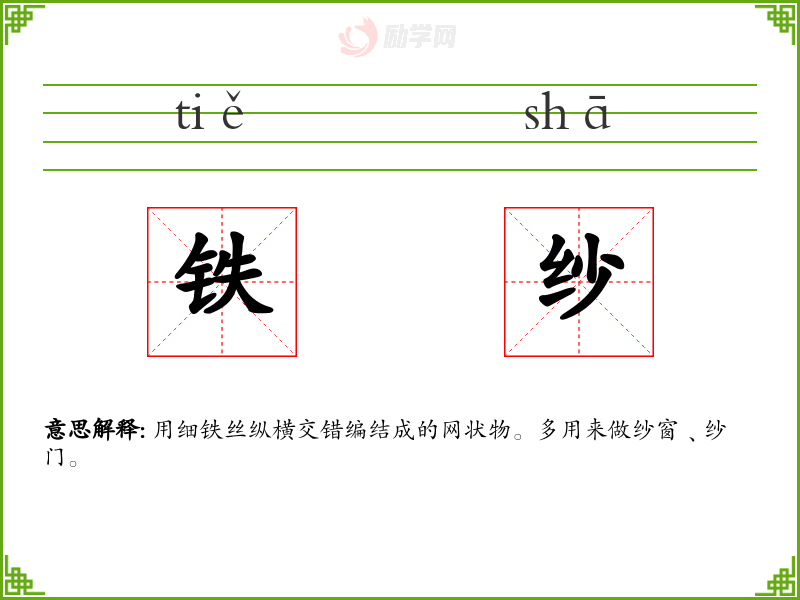 铁纱的意思是:用细铁丝纵横交错编结成的网状物。多用来做纱窗﹑纱门。