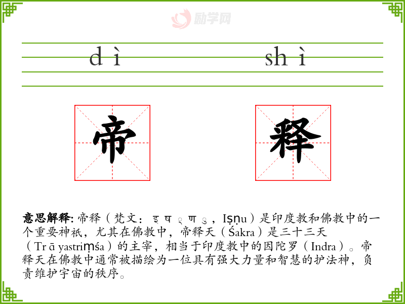 帝释的意思是:亦称"帝释天"; 佛教护法神之一。佛家称其为三十三天(忉利天)之主,居须弥山顶善见城。梵文音译名为释迦提桓因陀罗。