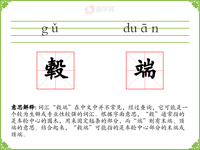 - 词源:“毂”字源于古代汉语,最初用于描述车轮的中心部分;“端”字则有末端、顶端的意思。