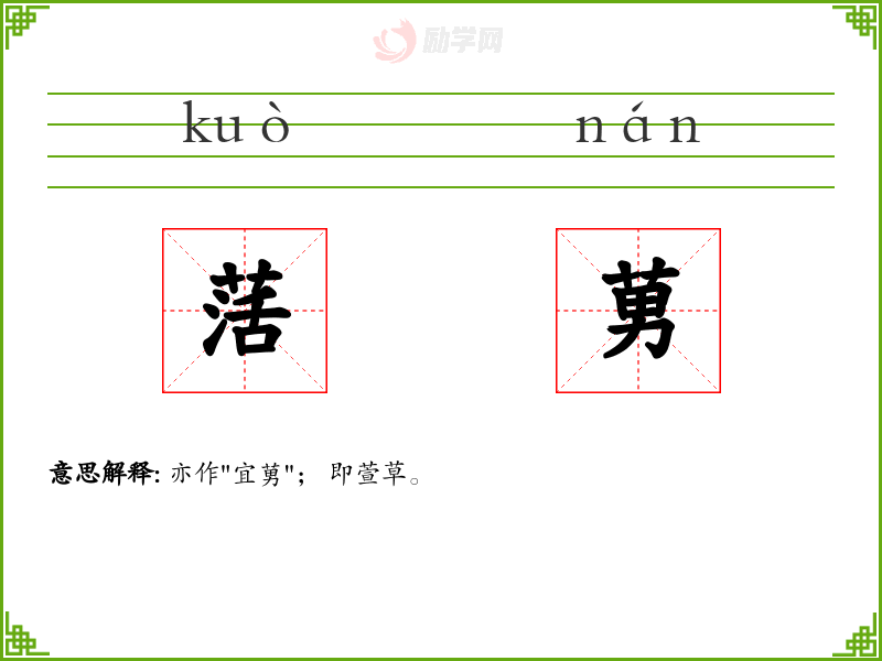 萿莮的意思是:亦作"宜莮"; 即萱草。