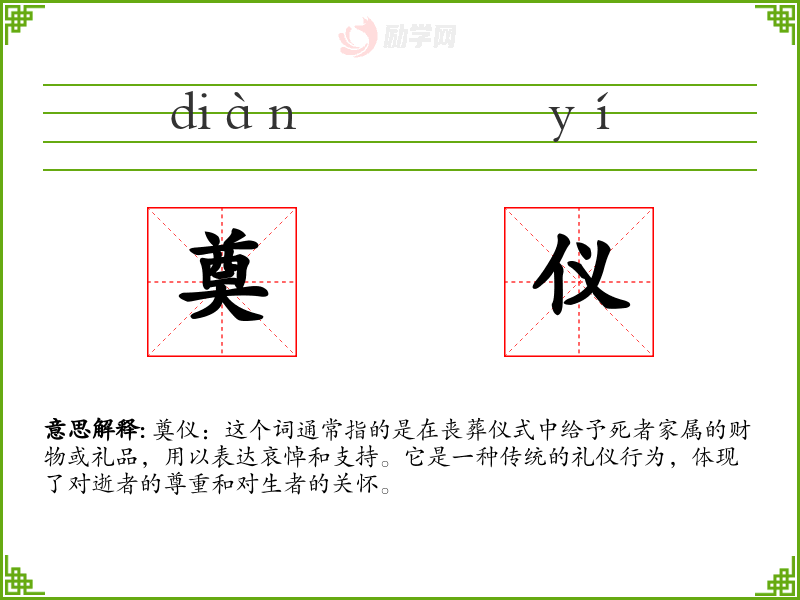 奠仪:这个词通常指的是在丧葬仪式中给予死者家属的财物或礼品,用以表达哀悼和支持。它是一种传统的礼仪行为,体现了对逝者的尊重和对生者的关怀。