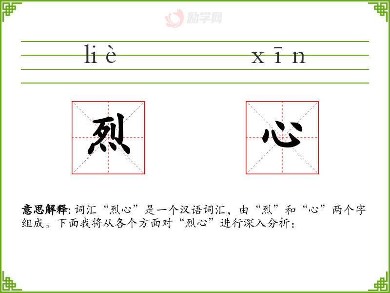 通过对“烈心”的深入分析,我更加理解了这个词的丰富内涵和它在不同语境中的应用。它不仅是一个词汇,更是一种精神的象征,激励人们在面对困难时保持坚定和勇敢。在语言学*和表达中,掌握这样的词汇能够丰富我的表达方式,增强语言的感染力。