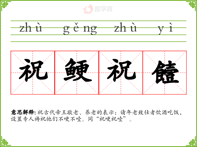 祝鲠祝饐的意思是:祝古代帝王敬老、养老的表示:请年老致仕者饮酒吃饭,设置专人祷祝他们不哽不噎。同“祝哽祝噎”。
