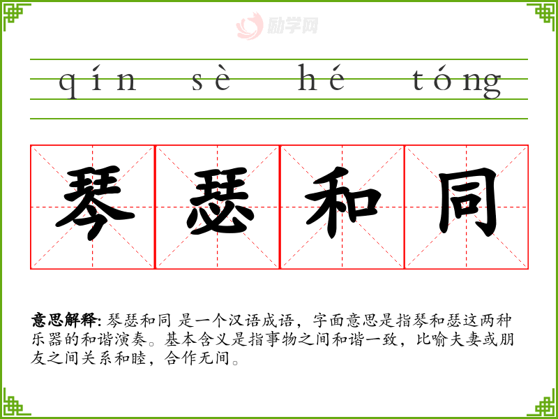 琴瑟和同 是一个汉语成语,字面意思是指琴和瑟这两种乐器的和谐演奏。基本含义是指事物之间和谐一致,比喻夫妻或朋友之间关系和睦,合作无间。