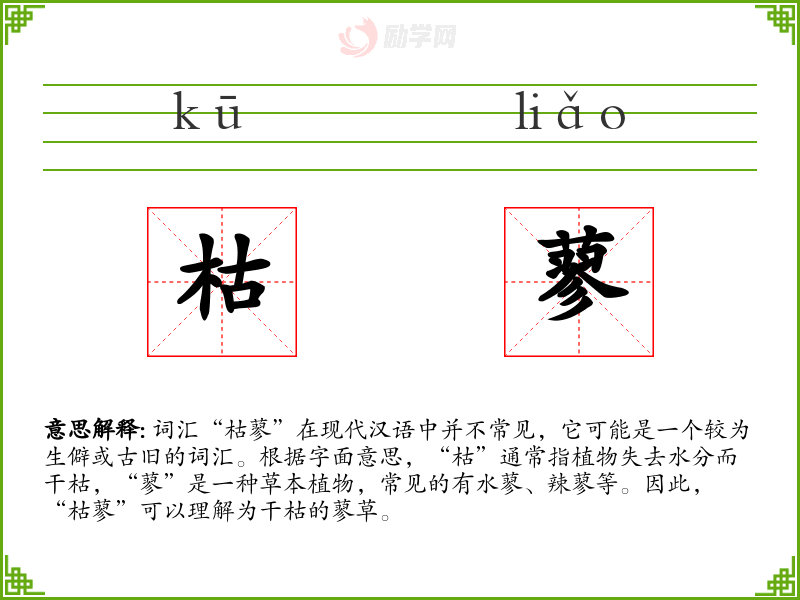 - 词源:“枯”和“蓼”都是古代汉语中的词汇,组合起来形容一种特定的植物状态。