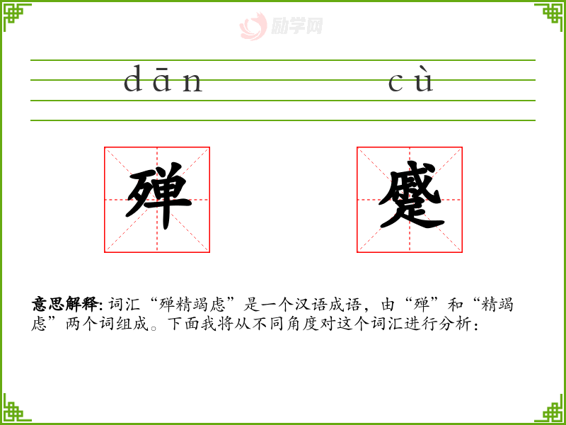 词汇“殚精竭虑”是一个汉语成语,由“殚”和“精竭虑”两个词组成。下面我将从不同角度对这个词汇进行分析:
