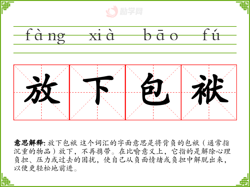 放下包袱 这个词汇的字面意思是将背负的包袱(通常指沉重的物品)放下,不再携带。在比喻意义上,它指的是解除心理负担、压力或过去的困扰,使自己从负面情绪或负担中解脱出来,以便更轻松地前进。