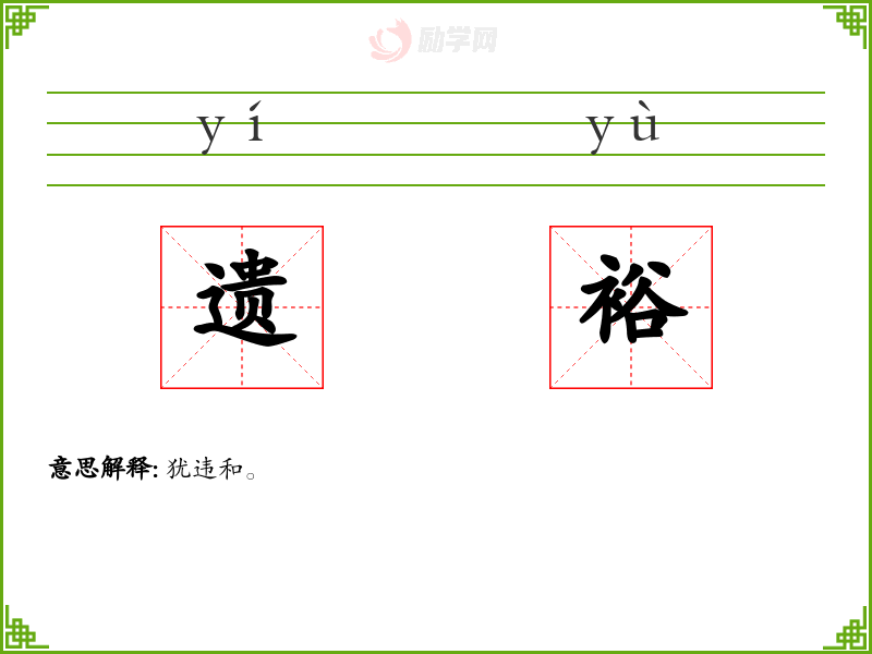 遗[ wèi,yí ] 1. (形声。从辵(chuò),贵声。本义:遗失)。 2. 同本义。 【引证】 《说文》-遗,亡也。 《释言》-遗,离也。 《易·泰》-不遐遗。 《左伟·成公十六年》。注:“失也。”-君惟不遗德刑。 《列子·说符》。注:“弃也。”-得人遗契者。 汉·贾谊《过秦论》-亡矢遗镞。 《后汉书·列女传》-羊子尝行路,得遗金一饼。 唐·韩愈《师说》-小学而大遗。 唐·韩愈《朱文公校昌黎先生集》-行若遗。 【组词】 遗簪坠屡、 遗佚、 遗逸、 遗宝、 遗简 [更多解释]