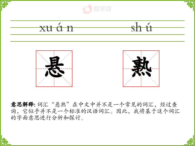 “悬熟”字面意思可能是指某事物处于悬而未决的状态,但同时又接近成熟或完成的状态。这个词汇可能是由“悬”和“熟”两个字组合而成,其中“悬”通常表示悬挂、未决或不确定,而“熟”则表示成熟、熟练或完成。