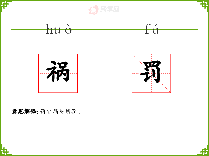 《说文》-禍,害也。神不福也。 《周礼·掌客》-禍灾杀礼。 《史记·屈原贾生列传》-禍兮福所倚。 《荀子·天论》-逆其类者谓之禍。 《论衡·累害》-来不由我,古谓之祸。 《韩非子·大体》-鱼无失水之祸。 《韩非子·十过》-不顾国政,则亡国之祸也。 《战国策·赵策》-近者祸及身。 《淮南子·人间训》-不能为祸。 明·魏禧《大铁椎传》-祸且及汝。 《资治通鉴》-祸至无日。 清·龚自珍《病梅馆记》-文人画士之祸。 《广东军务记》-祸及枯骨。