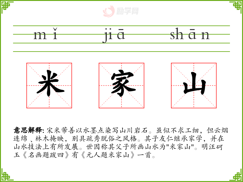 米家山的意思是:宋米芾善以水墨点染写山川岩石。虽似不求工细,但云烟连绵﹑林木掩映,别具疏秀脱俗之风格。其子友仁继承家学,并在山水技法上有所发展。世因称其父子所画山水为"米家山"。明汪砢玉《名画题跋四》有《元人题米家山》一首。