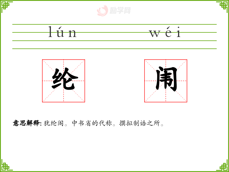 纶闱的意思是:犹纶阁。中书省的代称。撰拟制诰之所。