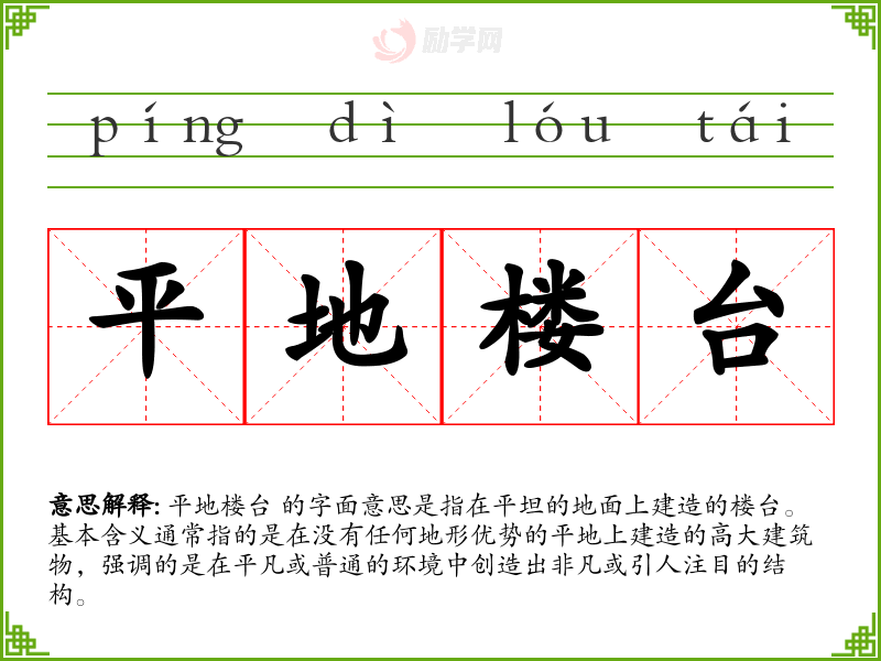 “平地楼台”这个词汇不仅描述了在平地上建造的楼台,更是一种象征,代表了在平凡中创造非凡的能力和精神。在我的语言学*和表达中,它提醒我要珍惜每一个机会,即使在最不起眼的环境中也要努力创造价值。
