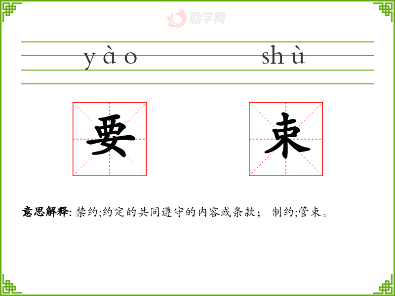 要束的意思是:禁约;约定的共同遵守的内容或条款; 制约;管束。