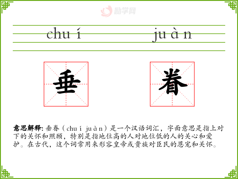 垂眷(chuí juàn)是一个汉语词汇,字面意思是指上对下的关怀和照顾,特别是指地位高的人对地位低的人的关心和爱护。在古代,这个词常用来形容**或贵族对臣民的恩宠和关怀。