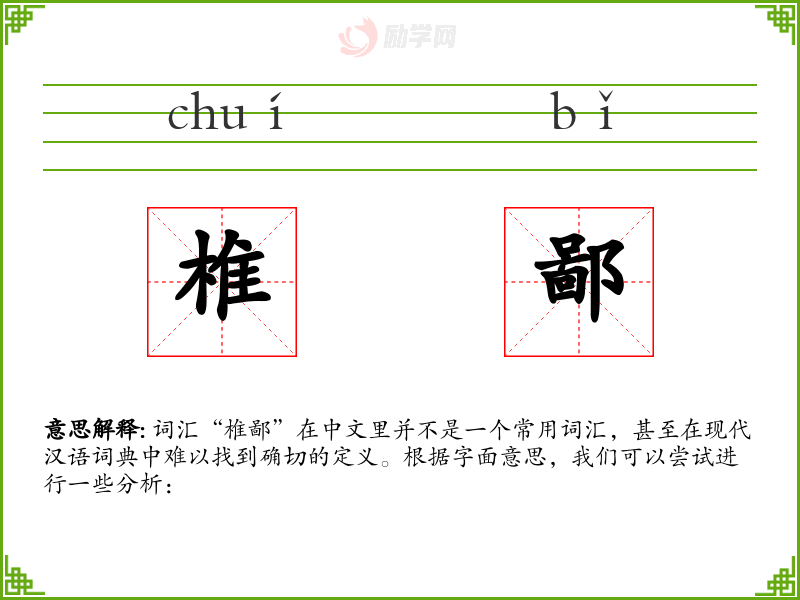 词汇“椎鄙”在中文里并不是一个常用词汇,甚至在现代汉语词典中难以找到确切的定义。根据字面意思,我们可以尝试进行一些分析: