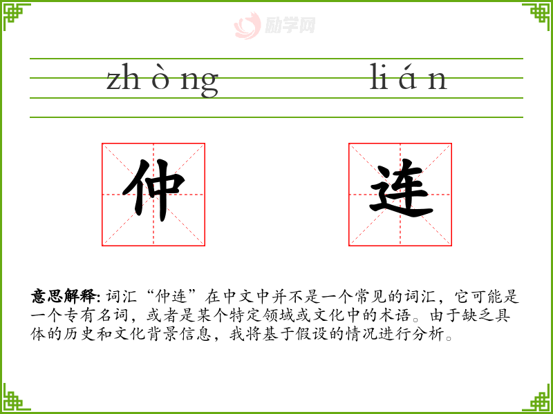 词汇“仲连”在中文中并不是一个常见的词汇,它可能是一个专有名词,或者是某个特定领域或文化中的术语。由于缺乏具体的历史和文化背景信息,我将基于假设的情况进行分析。