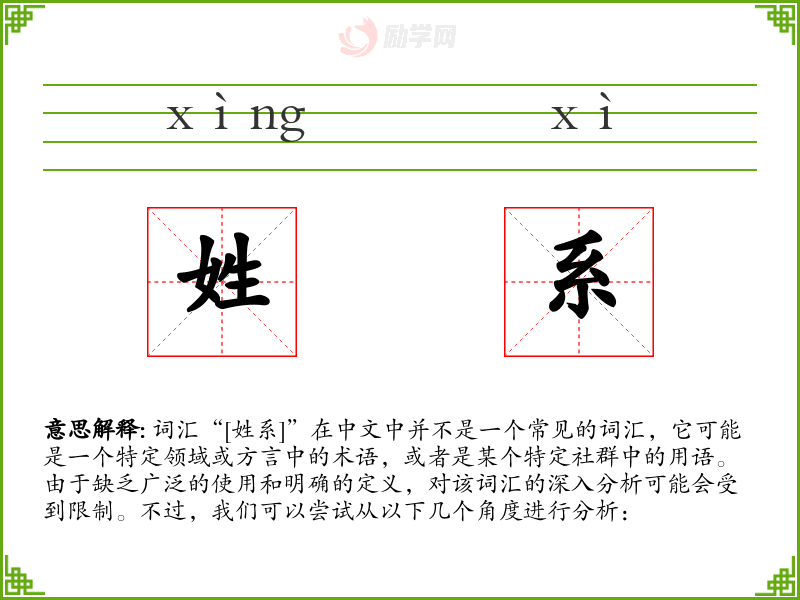 同义词可能包括“家族”、“血统”、“宗族”等,这些词汇都与姓氏和家族关系有关。反义词可能不太适用,因为“[姓系]”不是一个常见的对比词汇。