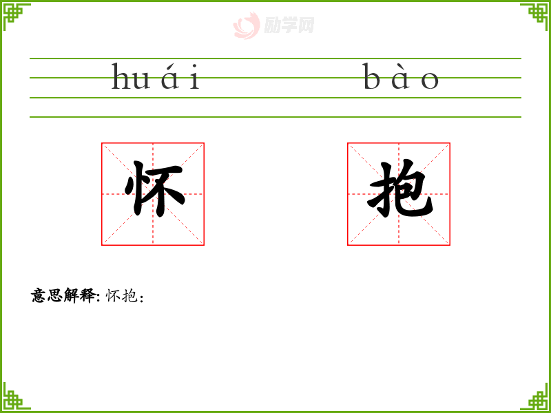 - 词源:“怀抱”由“怀”和“抱”两个字组成,“怀”指心中,“抱”指用手臂围住。
