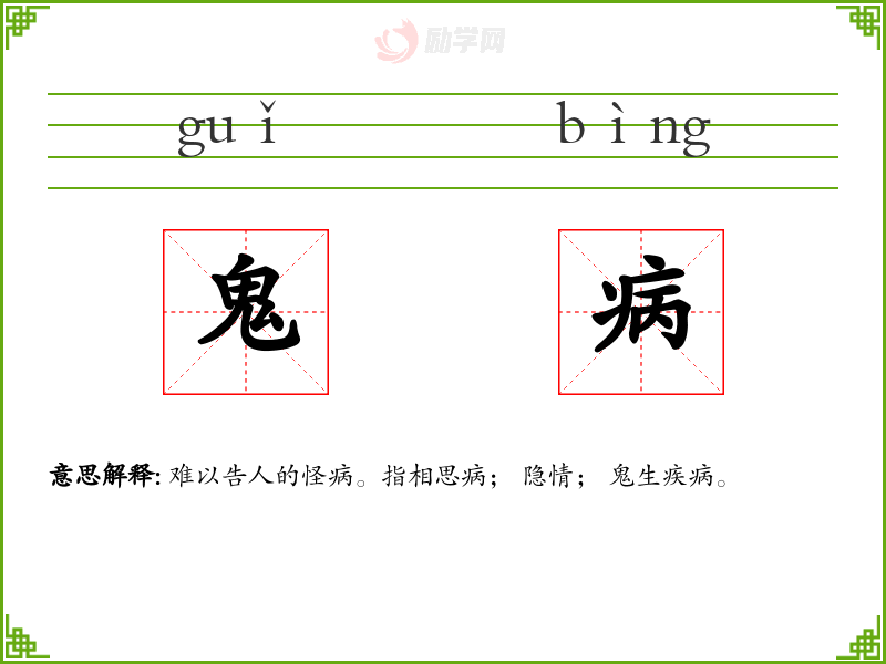 鬼病的意思是:难以告人的怪病。指相思病; 隐情; 鬼生疾病。