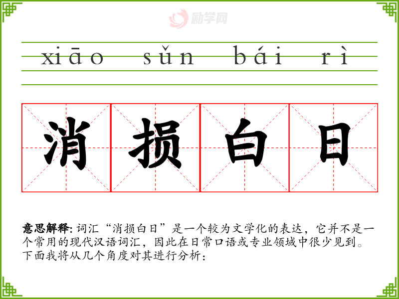 词汇“消损白日”是一个较为文学化的表达,它并不是一个常用的现代汉语词汇,因此在日常口语或专业领域中很少见到。下面我将从几个角度对其进行分析: