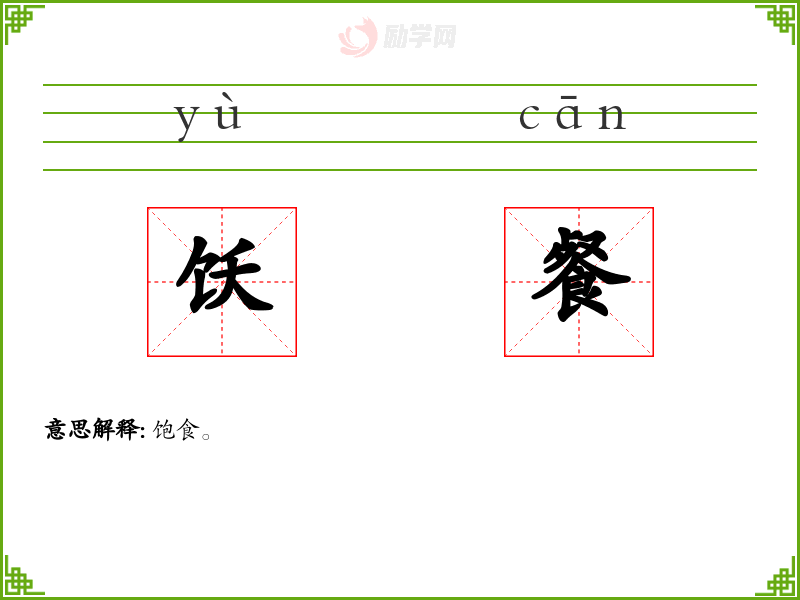 《说文》-餐,吞也。 《广雅》-餐,食也。 《方言一》。注:“昼饭为餐,晚饭为飧。”-相谒而餐。 《诗·魏风·伐檀》-彼君子兮,不素餐兮。 《汉书·高帝纪》-列侯幸得赐餐钱奉邑。