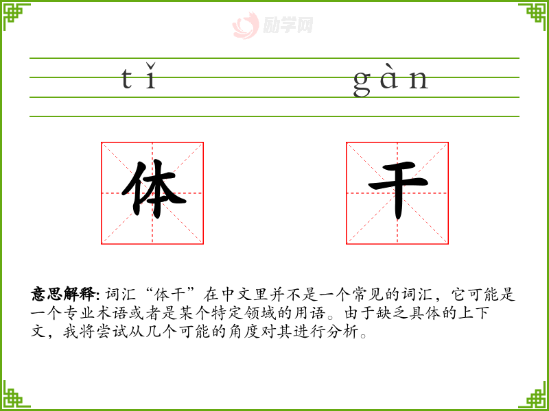 词汇“体干”在中文里并不是一个常见的词汇,它可能是一个专业术语或者是某个特定领域的用语。由于缺乏具体的上下文,我将尝试从几个可能的角度对其进行分析。
