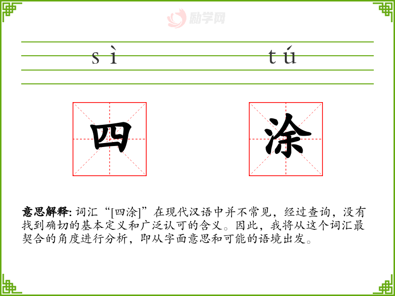 词汇“[四涂]”在现代汉语中并不常见,经过查询,没有找到确切的基本定义和广泛认可的含义。因此,我将从这个词汇最契合的角度进行分析,即从字面意思和可能的语境出发。