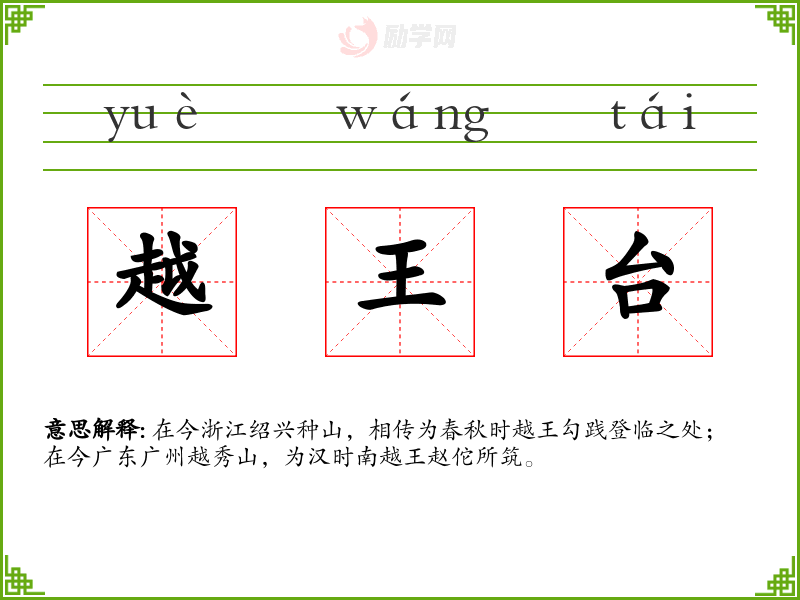 越王台的意思是:在今浙江绍兴种山,相传为春秋时越王勾践登临之处; 在今广东广州越秀山,为汉时南越王赵佗所筑。