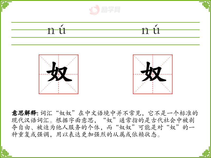 - 演变:随着社会的发展,“奴”字的含义逐渐固定为指代从属地位的人。