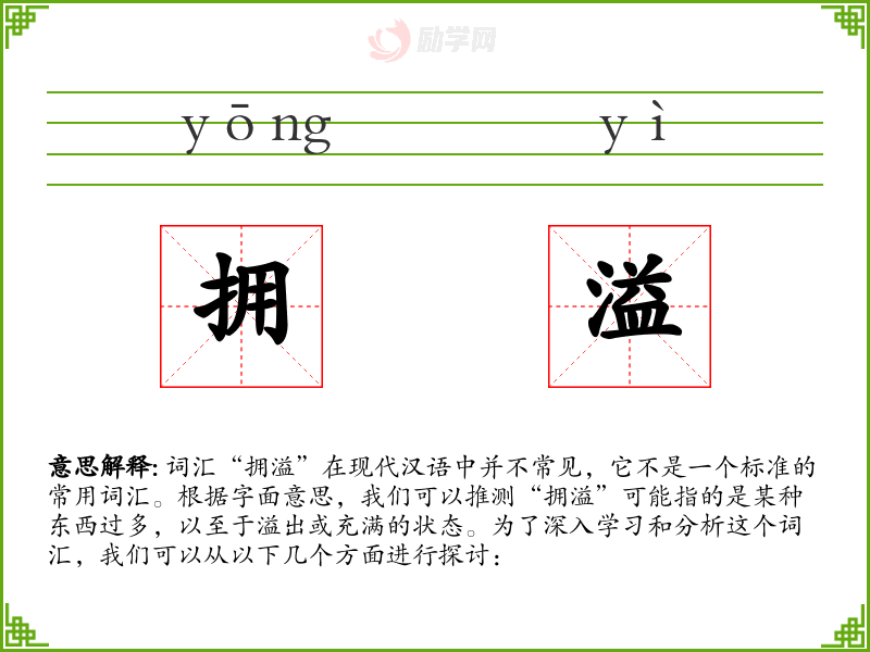 词汇“拥溢”在现代汉语中并不常见,它不是一个标准的常用词汇。根据字面意思,我们可以推测“拥溢”可能指的是某种东西过多,以至于溢出或充满的状态。为了深入学*和分析这个词汇,我们可以从以下几个方面进行探讨: