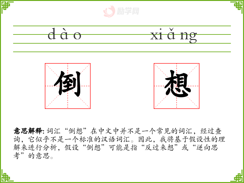 - 文学:在文学作品中,“倒想”可能用来描述主人公独特的思维方式,通过逆向思考解决问题。