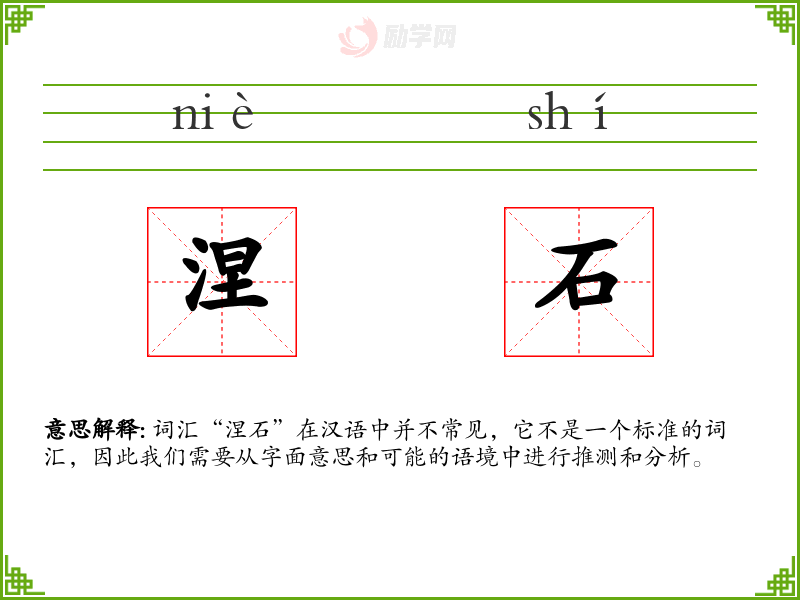 词汇“涅石”在汉语中并不常见,它不是一个标准的词汇,因此我们需要从字面意思和可能的语境中进行推测和分析。