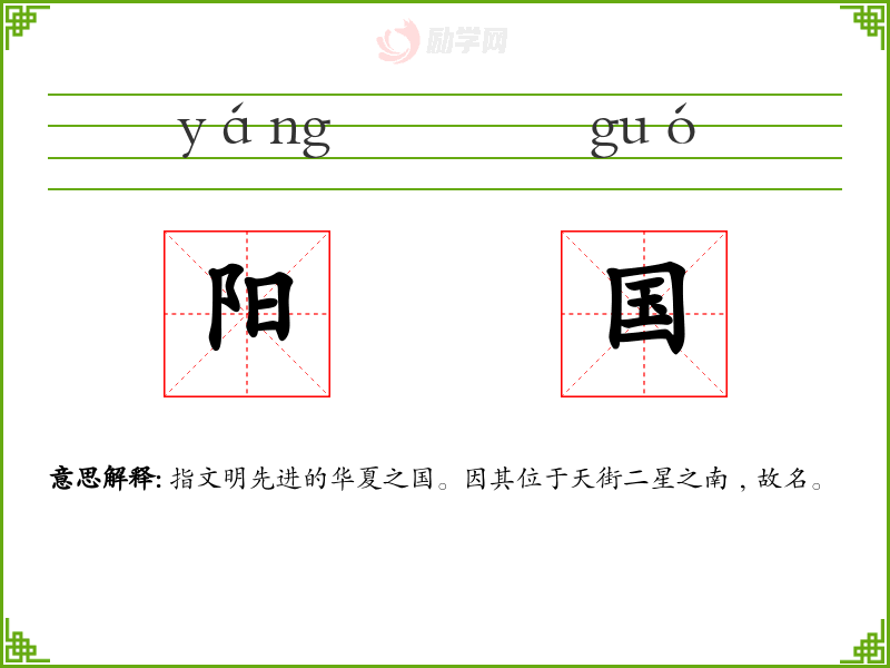 阳国的意思是:指文明先进的华夏之国。因其位于天街二星之南﹐故名。