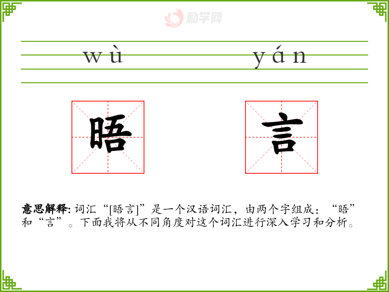 词汇“[晤言]”是一个汉语词汇,由两个字组成:“晤”和“言”。下面我将从不同角度对这个词汇进行深入学*和分析。