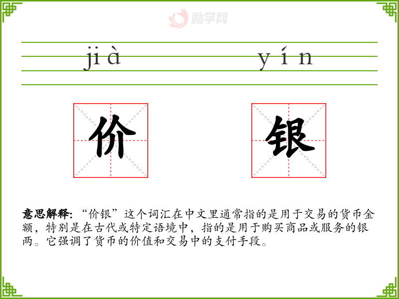 - 专业领域:在历史学或考古学中,研究古代货币交易时可能会使用“价银”来具体指代古代的货币单位。