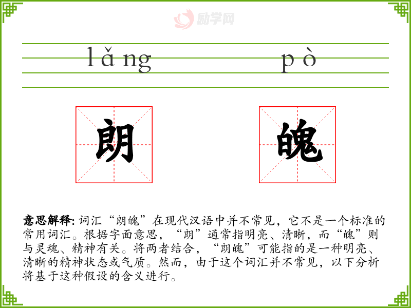 词汇“朗魄”在现代汉语中并不常见,它不是一个标准的常用词汇。根据字面意思,“朗”通常指明亮、清晰,而“魄”则与灵魂、精神有关。将两者结合,“朗魄”可能指的是一种明亮、清晰的精神状态或气质。然而,由于这个词汇并不常见,以下分析将基于这种假设的含义进行。