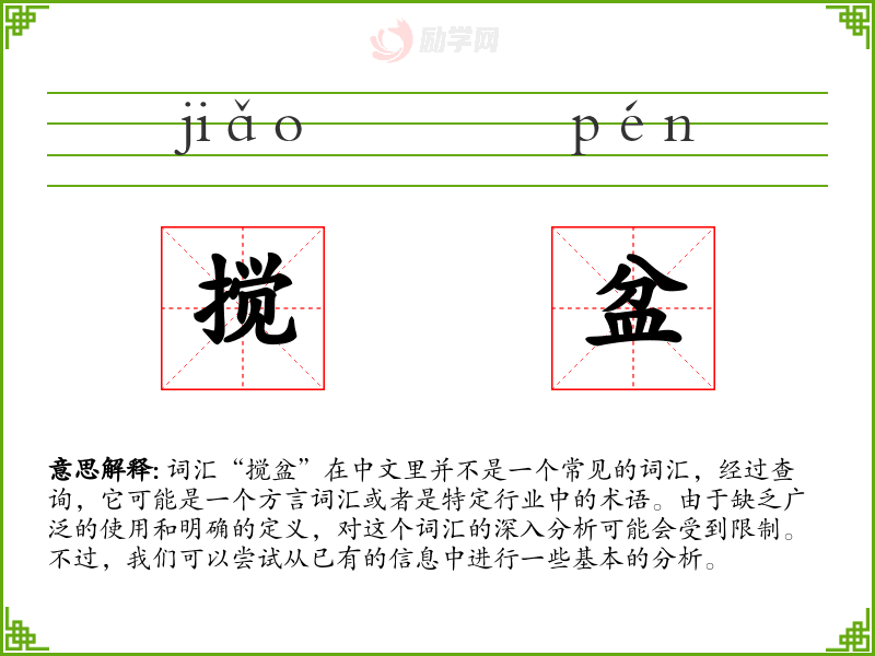 词汇“搅盆”在中文里并不是一个常见的词汇,经过查询,它可能是一个方言词汇或者是特定行业中的术语。由于缺乏广泛的使用和明确的定义,对这个词汇的深入分析可能会受到限制。不过,我们可以尝试从已有的信息中进行一些基本的分析。