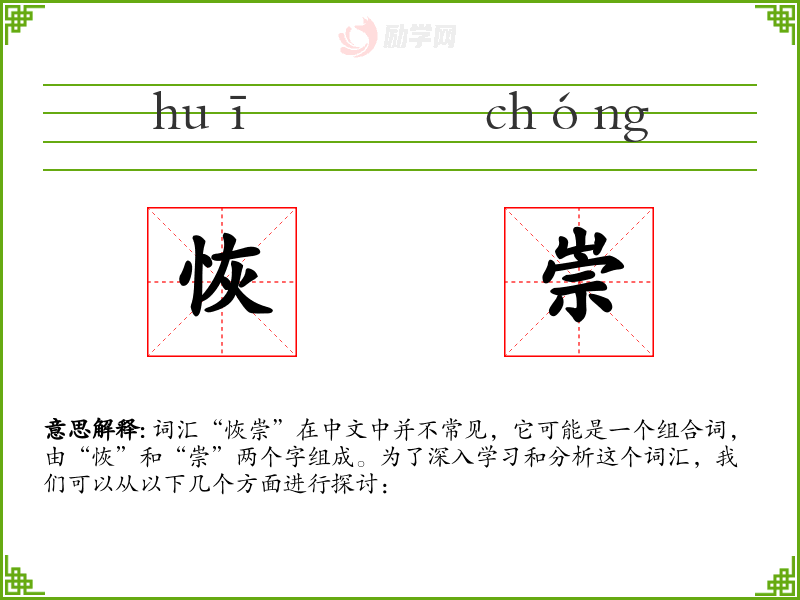词汇“恢崇”在中文中并不常见,它可能是一个组合词,由“恢”和“崇”两个字组成。为了深入学习和分析这个词汇,我们可以从以下几个方面进行探讨: