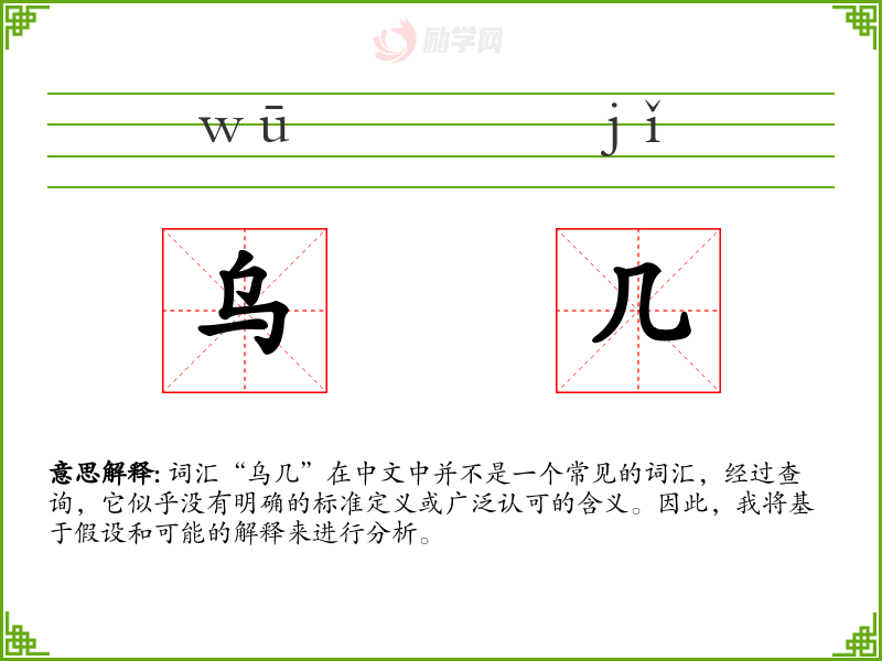 词汇“乌几”在中文中并不是一个常见的词汇,经过查询,它似乎没有明确的标准定义或广泛认可的含义。因此,我将基于假设和可能的解释来进行分析。