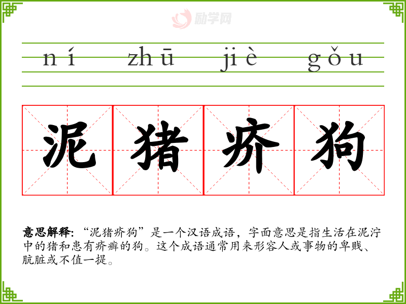 “泥猪疥狗”是一个汉语成语,字面意思是指生活在泥泞中的猪和患有疥癣的狗。这个成语通常用来形容人或事物的卑贱、肮脏或不值一提。