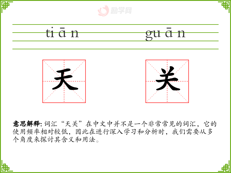 词汇“天关”在中文中并不是一个非常常见的词汇,它的使用频率相对较低,因此在进行深入学*和分析时,我们需要从多个角度来探讨其含义和用法。